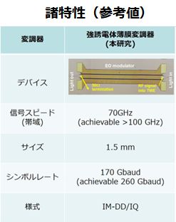 技術:光変調素子 当社が事業化を目指すデバイスは、デジタルの電気信号データを光信号データに高速変換する次世代型の光通信の大容量化・高速化に必須となるキーパーツです。従来のデバイスでは到達が困難な光変調のスピードを、高い電気光学効果を有する結晶性薄膜の成長技術により実現可能としました。