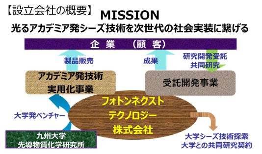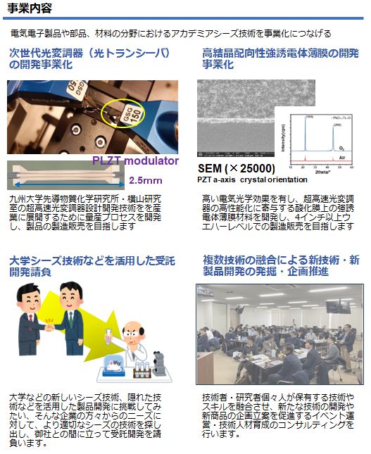 事業内容 次世代超高速光トランシーバー材料およびデバイスの開発/事業化(大学発シーズ技術の実用化) 電気電子製品・部品・材料の開発/製造/販売事業(主に大学発シーズ技術の実用化) 上記およびその他の技術分野における受託開発事業 大学発シーズ技術に関するコンサルティング、技術調査請負
